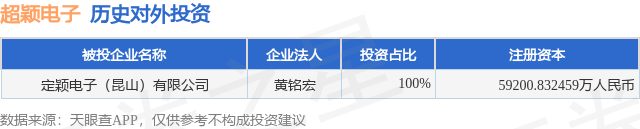 本站消息,根据天眼查APP显示,超颖电子(603175.SH)新增一起对外投资事件,被投资公司为定颖电子(昆山)有限公司,法定代表人黄铭宏,投资占比为100%。该公司从事计算机、通信和其他电子设备制造业,注册资本为59200.832459万人民币。目前,超颖电子共存在对外投资1项,详见下表:
