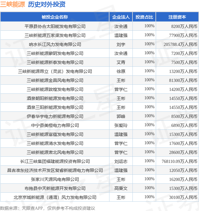 本站消息,根据天眼查APP显示,三峡能源(600905.SH)新增一起对外投资事件,被投资公司为三峡(青岛)海洋发展有限公司,法定代表人艾青,投资占比为51%。该公司从事电力、热力生产和供应业,注册资本为14889万人民币。目前,三峡能源共存在对外投资417项,投资占比前20的项目见下表: